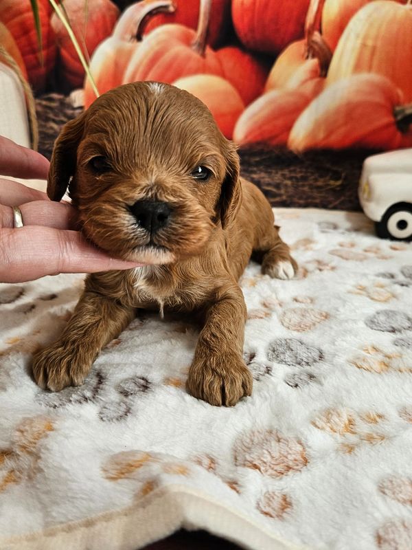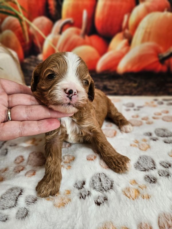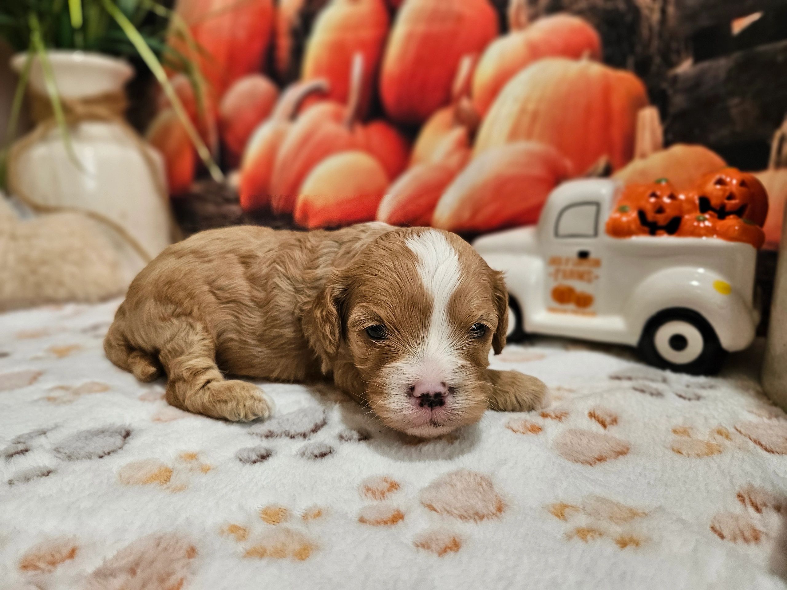 Here's a picture of on of our previous Blenheim colored Cavapoo puppies!