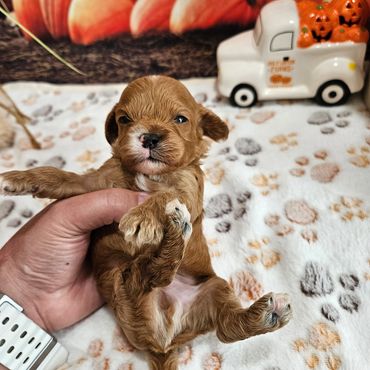 Meet Rae, an adorable red and white F1 Cavapoo male with the sweetest personality! He has a soft, wavy coat and four perfect white boots that make him stand out. Rae is affectionate, friendly, and loves attention. He’s playful and outgoing, yet gentle and loving, making him the perfect addition to any home. This little guy is sure to bring smiles and joy wherever he goes! He was born on 9/25, and is ready to join his family on 11/23 and after. This darling boy is $1600.