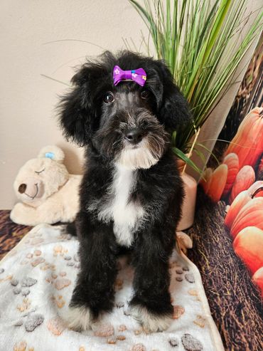 If you're looking for a sweet girl that enjoys going on adventures, and spending time with her family, then Sabrina is the girl for you! She is our stunning black and white F1B Aussidoodle puppy! Sabrina is certain to capture glances from everyone she meets with her adorable personality and gorgeous coat! This cutie is $650. She was born on 6/24/25, and is ready to join her family now. Her mom, Snickers, is our gorgeous Blue Merle F1 Aussiedoodle female and she weighs 20 lbs. Her dad, Ryder, is our gorgeous Red Miniature AKC poodle, and he weighs 16 lbs. Your puppy comes vet checked from head to tail, microchipped with AKC reunite microchip, one-year genetic health guarantee, one-month free pet insurance thru Trupanion, started on potty and crate training, socialized and dew claws are removed. Don't miss out, reserve this precious puppy now! Message Jennifer or Kyle now for information! Shipping options are available in the US only.