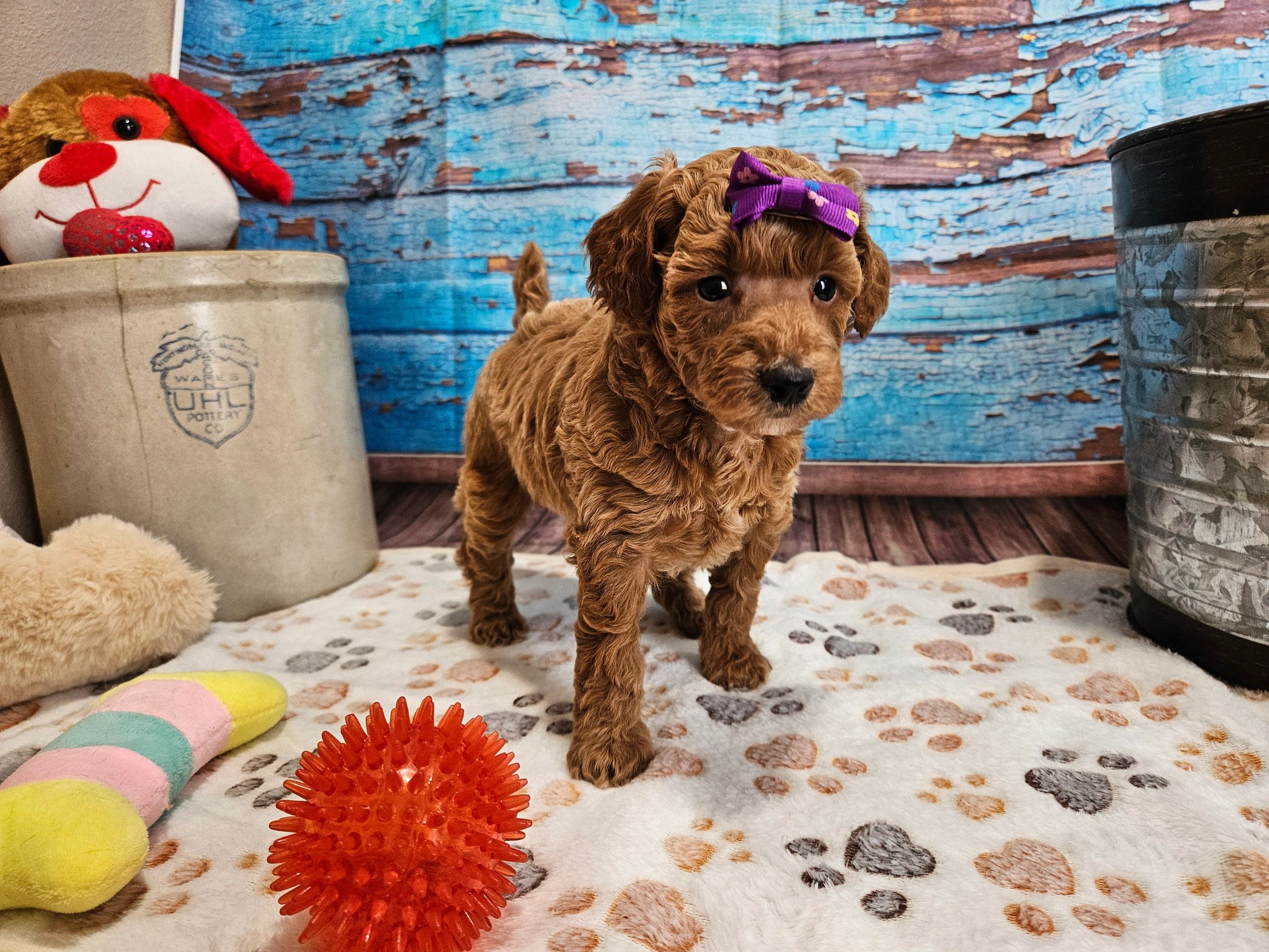 Willow is a beautiful apricot and white F1B Aussiedoodle female with a gentle, loving personality and a playful spirit. She enjoys cuddles, attention, and spending time with people. Willow has a soft, fluffy coat and a sweet expression that will quickly melt your heart. With her affectionate nature and adorable looks, she is sure to grow into a loyal and devoted companion. This sweet puppy is ready to bring lots of joy, cuddles, and happy moments to her forever home. Mom is a F1 blue merle Aussiedoodle, and dad is our red AKC miniature poodle male. She is $1200.